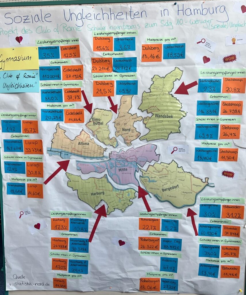 Wir als Club of Rome Schule haben im letzten und aktuellen Schuljahr den Fokus auf das nachhaltige Ziel „Weniger Ungleichheiten“ (SDG 10) gelegt. In diesem Kontext haben wir die großen sozialen Ungleichheiten in den verschiedenen Stadtteilen Hamburgs beziffert und mit Politikern demokratischer Parteien über Chancengleicheit diskutiert. Dabei wurden Aspekte wie die Erbschafts- oder Vermögenssteuer sowie der Stellenwert einer hochwertigen Schulbildung aus unterschiedlichen Perspektiven beleuchtet. Auch in diesem Schuljahr möchten wir im Gespräch darüber bleiben, wie unsere Gesellschaft allen Menschen die gleichen Chancen im Leben ermöglichen kann.