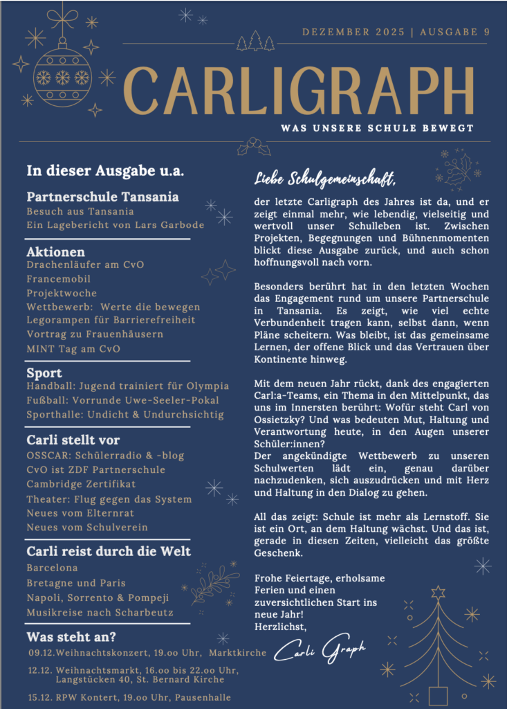 CARLIGRAPH No. 9 von Autor · 5. Dezember 2025 Der letzte Carligraph des Jahres ist da, und er zeigt einmal mehr, wie lebendig, vielseitig und wertvoll unser Schulleben ist.
