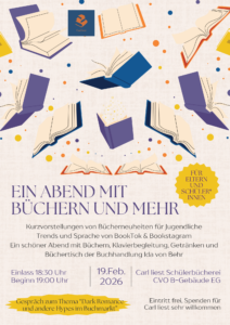 Unsere Schülerbücherei Carl liest möchte Sie und interessierte Schüler*innen gerne zu einem Abend mit Büchern und mehr einladen. Neben Kurzvorstellungen von Bücherneuheiten für jugendliche Leser*innen möchten wir Sie mitnehmen in eine kleine Reise durch die Hypes von BookTok, Bookstagram & Co. In einem Gespräch mit einer jungen goodreads Bloggerin werden wir auf Tropes und andere Begriffe der Szene eingehen, aber auch sensibilisieren für die teils problematischen und toxischen Inhalte gehypter Genres/Bücher. Im Anschluss an die Buchvorstellungen freuen wir uns, wenn Sie noch auf ein Glas bleiben wollen und mit uns ins Gespräch kommen. Zudem können sie die vorgestellten und andere Bücher direkt an einem Büchertisch der Buchhandlung Ida von Behr erstehen.